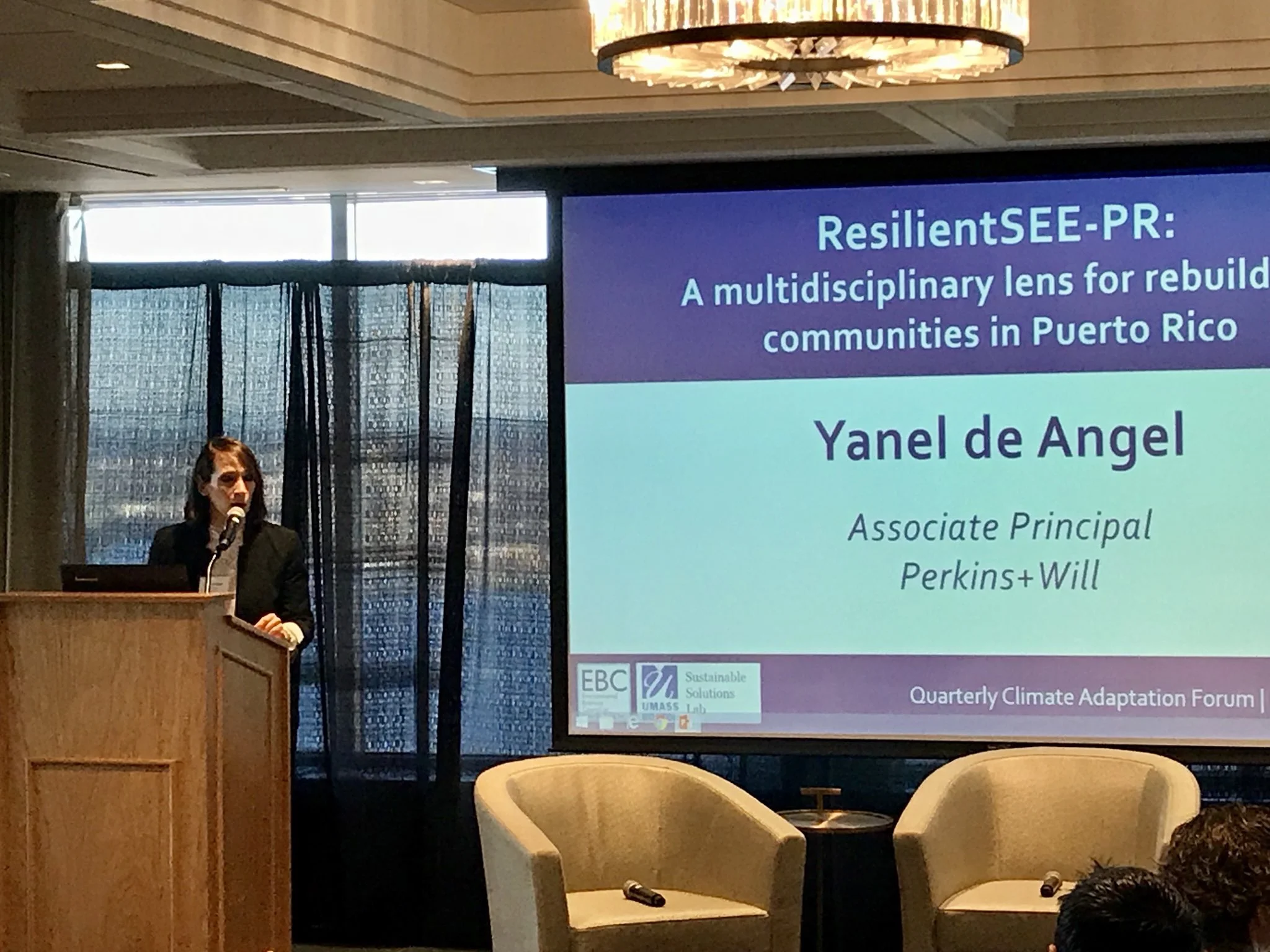 Climate Adaptation Forum, a quarterly discussion organized by the Environmental Business Council of New England and UMass Boston Sustainable Solutions Lab, recently hosted “Utility Resilience: Lessons from Puerto Rico.” I had the honor to speak, telling the story of how ResilientSEE formed and the work we have been conducting. In addition to island-wide analyses, we have been studying specific communities like the Toa Baja Municipality – where 48% of the terrain is a floodplain. With such severe challenges, we must work across disciplines and within communities to co-author sustainable, resilient solutions.